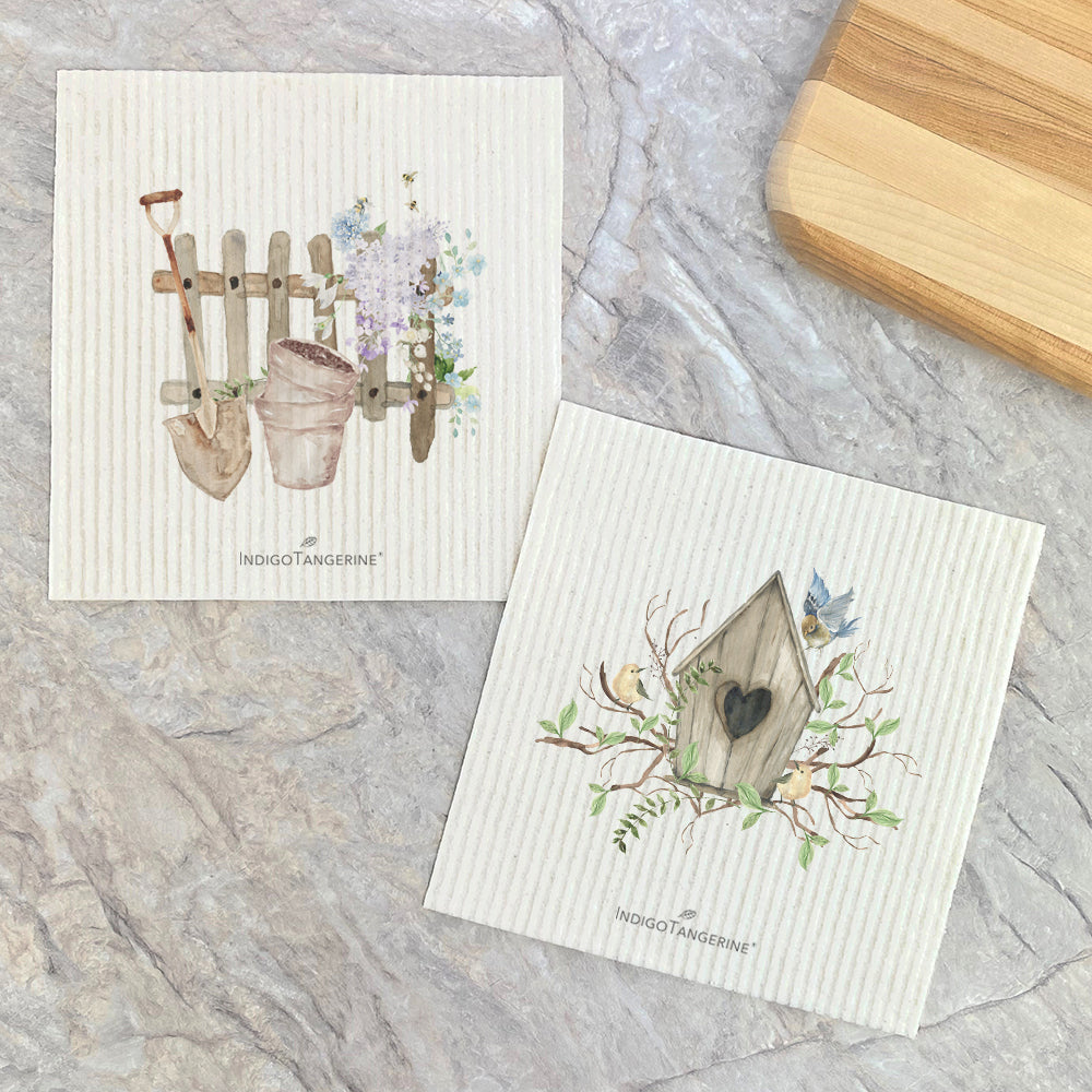 Spring Planting, Budding Birdhouse - 2pk Swedish Dish Cloth