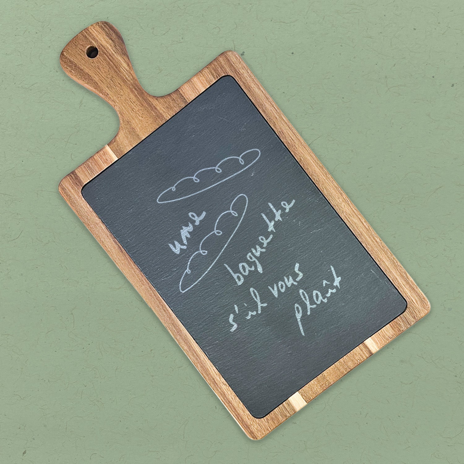 Designed to impress, these slate serving boards combine the natural warmth of acacia wood with the sleek texture of slate. Durable and stain-resistant, they're ideal for charcuterie boards, cheese platters, small bites or a thoughtful housewarming gift. A beautiful and functional display piece for any kitchen or gathering. Hand wash only.