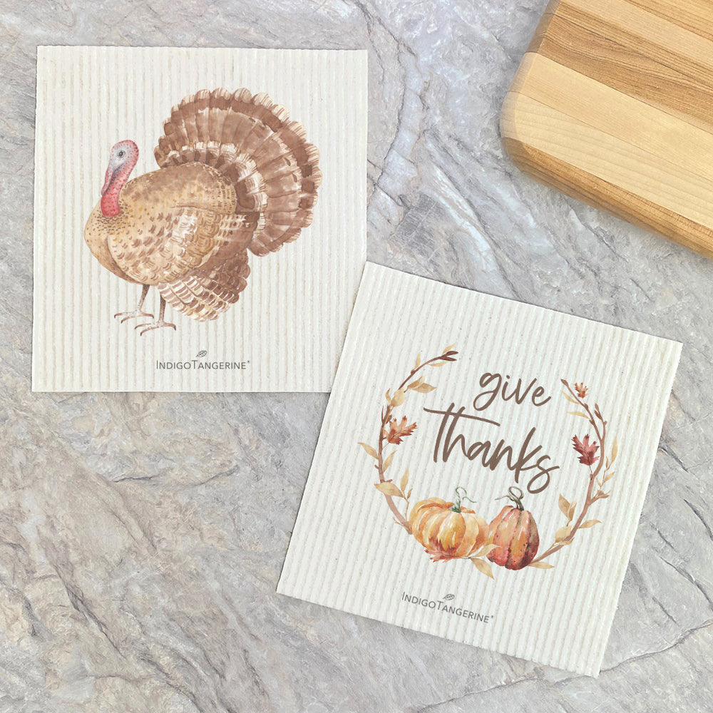 Watercolor Turkey, Give Thanks Pumpkins - 2pk Swedish Dish Cloth